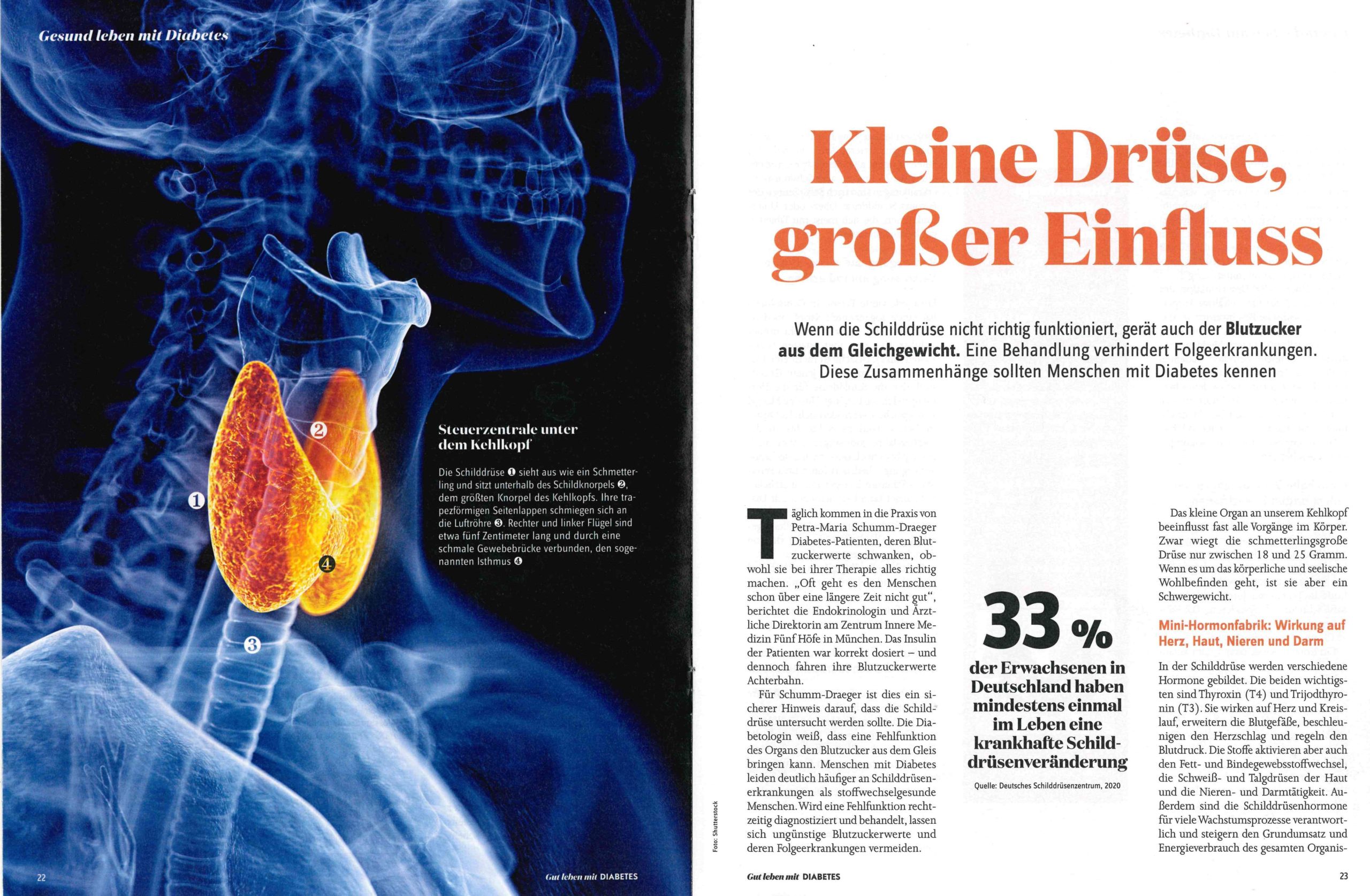 Für Schumm-Draeger ist dies ein sicherer Hinweis darauf, dass die Schilddrüse untersucht werden sollte. Die Diabetologin weiß, dass eine Fehlfunktion des Organs den Blutzucker aus dem Gleis bringen kann. Menschen mit Diabetes leiden deutlich häufiger an Schilddrüsenerkrankungen als stoffwechselgesunde Menschen. Wird eine Fehlfunktion rechtzeitig diagnostiziert und behandelt, lassen sich ungünstige Blutzuckerwerte und deren Folgeerkrankungen vermeiden.