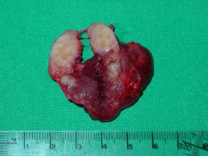 Kleines papilläres Karzinom (weißlich) mit weiteren kleinen Absiedlungen in einem normal großen Schilddrüsenlappen